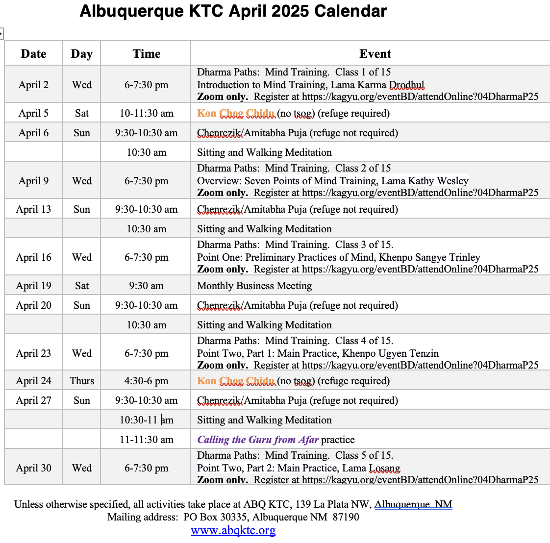 Here is the calendar for ABQ KTC Tibetan Buddhist Center for April 2025.