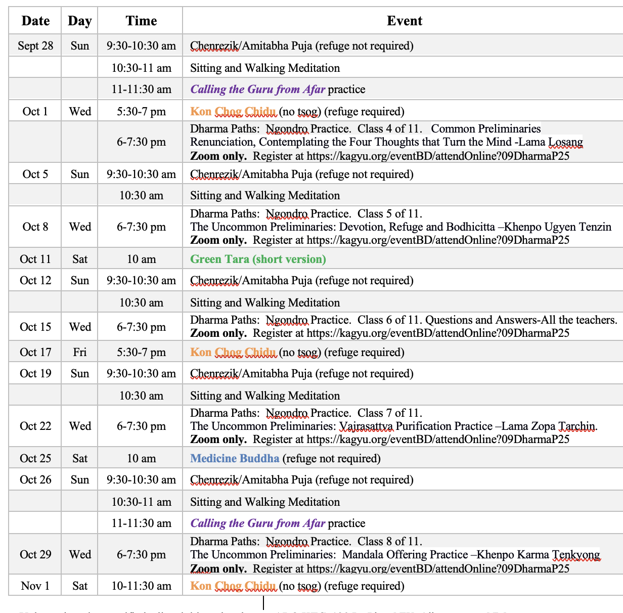 Tibetan Buddhist Center for the month of October. Below the calendar is