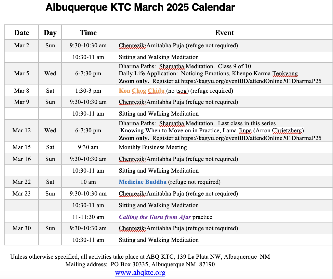Here is the calendar for the practices at ABQ KTC Tibetan Buddhist